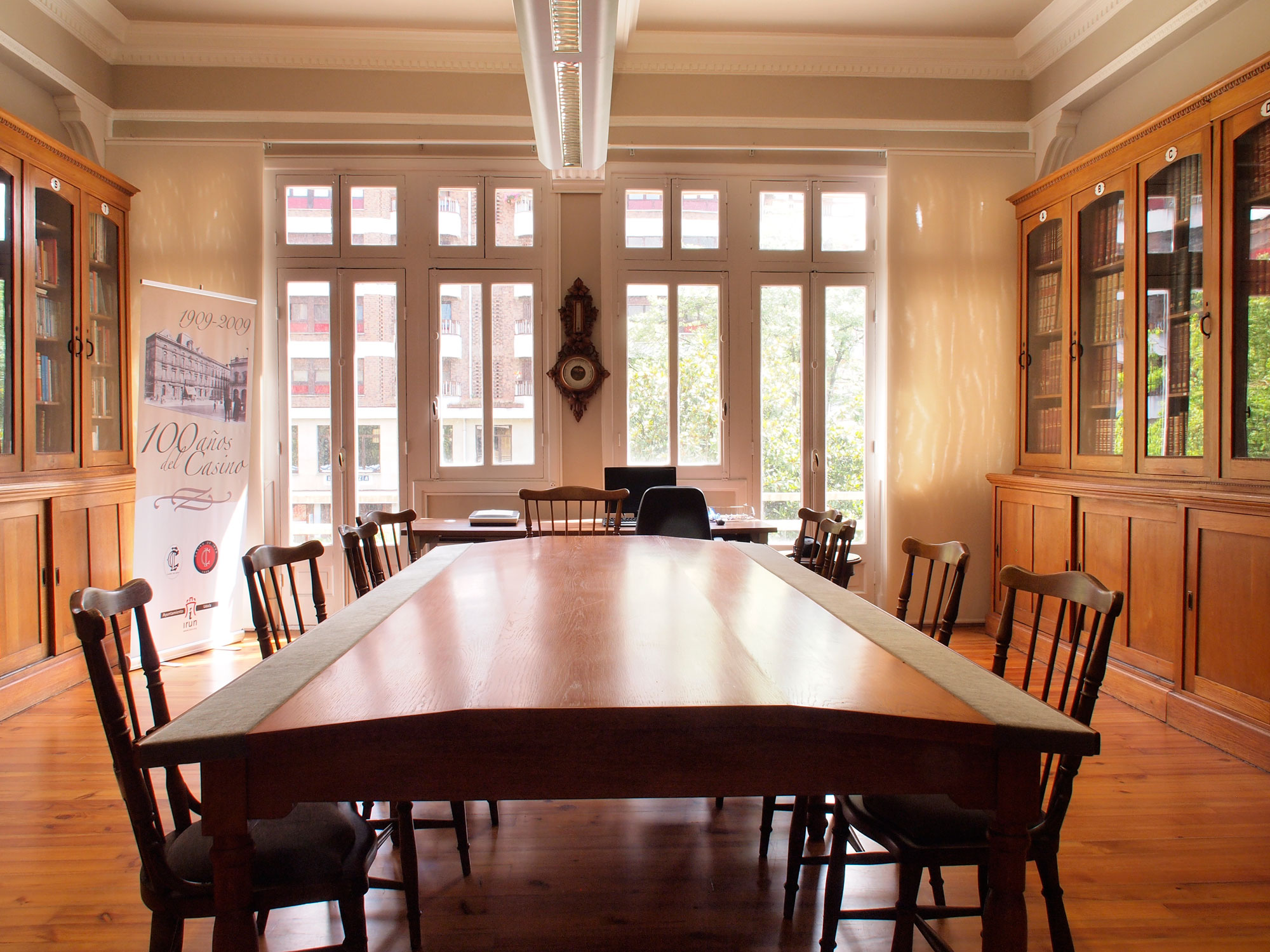 La Biblioteca del Casino se encuentra en la primera planta del edificio. Los acabados de la biblioteca (muy cuidada), son los siguientes, suelo de tarima de madera, paredes laterales revestidas por dos bibliotecas de madera maciza en forma de “L” con puertas superiores acristaladas y las bajas ciegas; salida al exterior mediante puertas balconeras, enmarcadas dentro de las carpinterías de fachadas formadas por dos grandes ventanales, con vidrios transparentes, sobre la terraza en la fachada Sur; techo decorado y pintado; y una gran mesa de reuniones en madera maciza tapizada, sitiada en el centro de la habitación. Hay un ordenador con conexión a Internet, así como un escaner, a disposición de los señores socios o de aquellos investigadores ajenos a la sociedad que, prevía autorización de la Junta Directiva, utilicen las instalaciones. La Biblioteca cuenta con fondos de gran valor reunidos desde la fundación del Casino de “La Amistad” en 1871 (la fusión del Casino de “La Amistad” con el “Irún Club” en 1909 dio lugar a la formación del actual Casino de Irun). Sin ánimo de ser exhaustivos podemos destacar obras como “El mundo ilustrado. Biblioteca de las familias” (Barcelona 1879); “El mundo en la mano. Viaje pintoresco a las Cinco partes del Mundo por los más célebres viajeros” (Barcelona, 1879); “Diccionario Basco-español”, de J. Francisco Aizquibel (Tolosa, 1884); “La Tierra y sus habitantes” (Barcelona, 1878); “América pintoresca” (Barcelona, 1884); “Historia Universal” dirigida por Guillermo Oncken (Barcelona 1890); “Diccionario Geográfico-Estadístico e Histórico de España y sus posesiones de Ultramar”, de Pascual Madoz (1845-1850); “Historia de la Revolución Francesa”, de A. Thiers (Barcelona, 1876); “Historia de la guerra civil”, de A. Pirala (Madrid, 1889), etc.A los títulos anteriores podemos añadir otros de carácter periódico tales como “La Ilustración Española y Americana” (años 1877-1902), “L'Illustration” francesa, la “Revista Contemporánea” (1878-1886) y obras de referencia como la “Enciclopedia universal ilustrada europeo-amerciana”, popularmente conocida como ESPASA, y su antecesor el “Diccionario Enciclopédico Hispano-Americano de Literatura, Ciencias y Artes”, editada por Montaner y Simón entre 1887 y 1898.