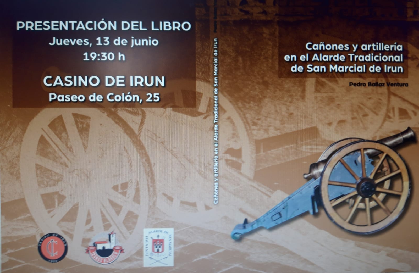 Este próximo jueves, 13 de junio a las 19;30 h, tendrá lugar en la sala Tellatueta de este Casino el acto de presentación del libro de Pedro Ballaz Ventura "CAÑONES Y ARTILLERÍA EN EL ALARDE TRADICIONAL DE SAN MARCIAL DE IRUN"